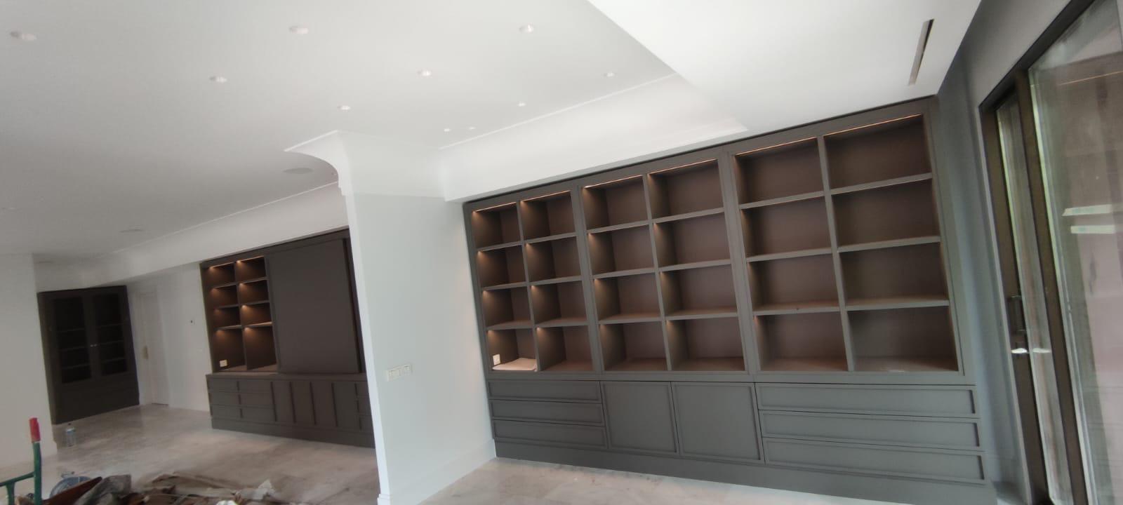 Librería mural a medida que ocupa toda la pared, maximizando el espacio de almacenaje y aportando continuidad visual al salón. Fabricada en Madrid con materiales de alta calidad.